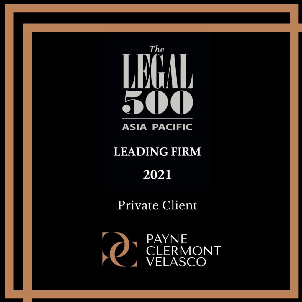 Payne Clermont Velasco is thrilled and proud to announce its ranking in the Legal500 Asia Pacific 2021 Guide. We are recommended for our practice in Private Client. Attaining this recognition demonstrates our market-leading position in the family and matrimonial arena.
